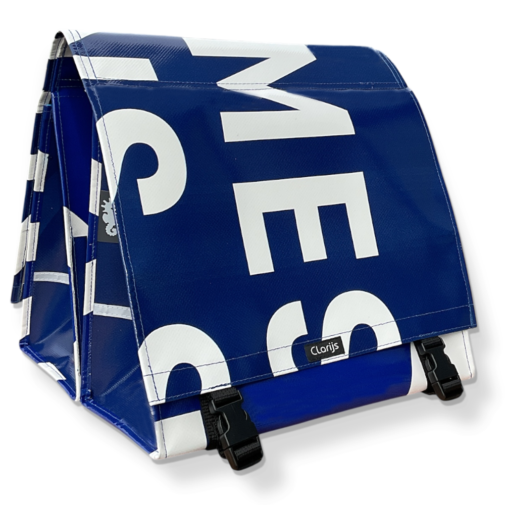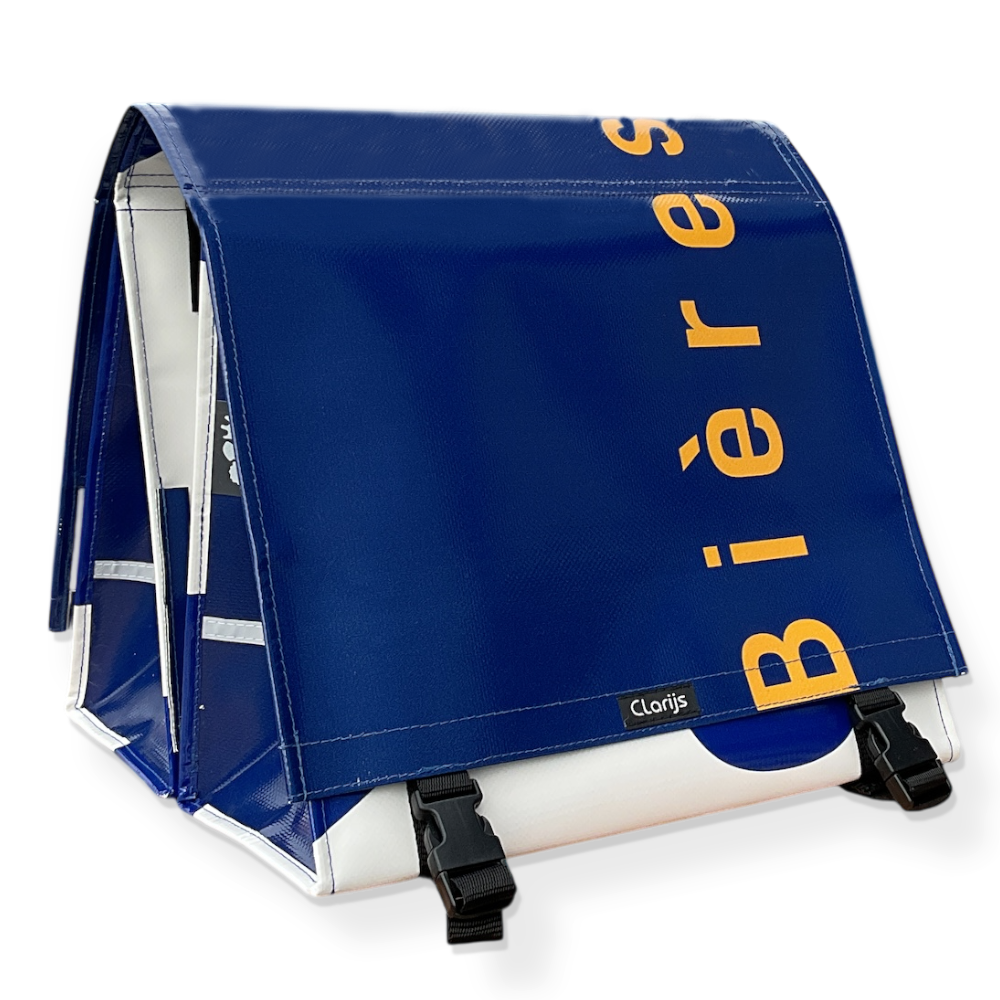 De Dubbele Fietstas reCYCLEd –Boissons van Clarijs is een duurzame, handgemaakte fietstas gemaakt van gerecycled vrachtwagendoek. Het materiaal is sterk, weerbestendig en ontworpen voor intensief dagelijks gebruik.